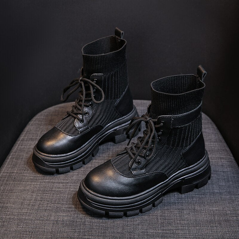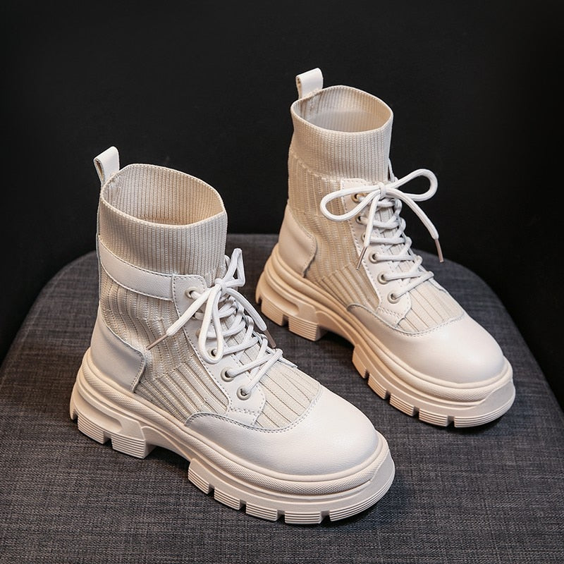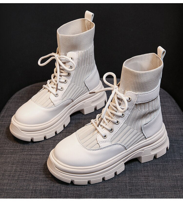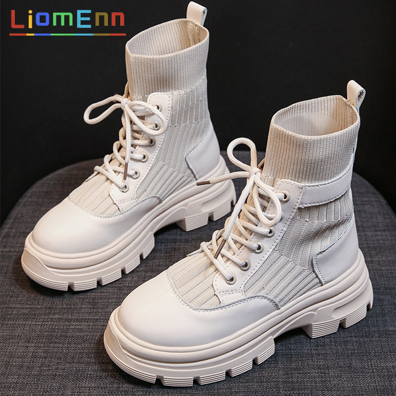 Women's Sock Boots 2021 Fashion Lace Up Chunky Motorcycle Boots Female Beige Black Platform Ankle Boots Punk Casual Shoes Woman